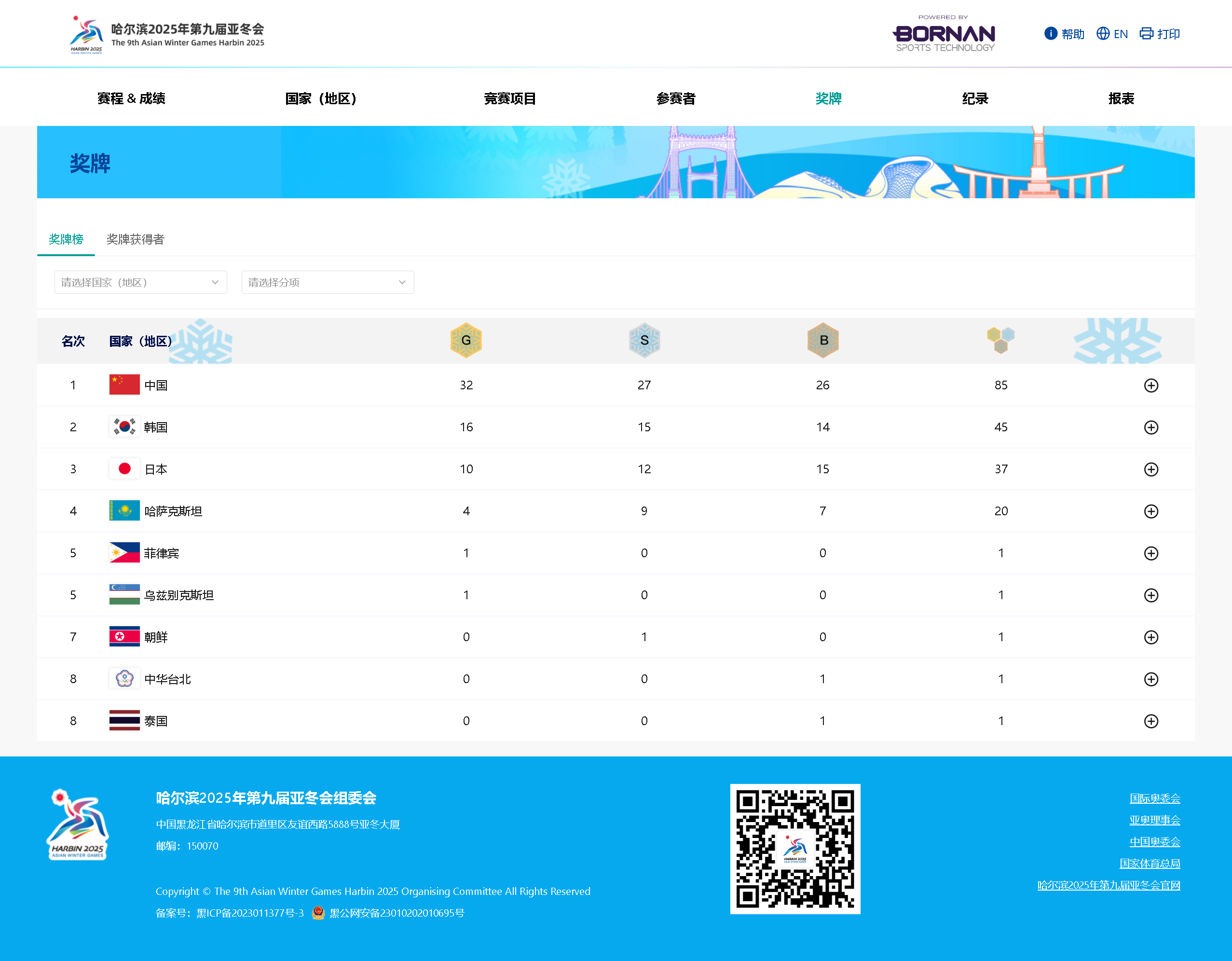 在過去8天里,來自亞洲34個國家和地區(qū)的1200多名運動員在這里突破自我、展現(xiàn)風(fēng)采、成就夢想、收獲友誼,以高超競技水平和頑強(qiáng)拼搏精神,書寫了亞洲冰雪運動新輝煌。中國秉持“綠色、共享、開放、廉潔”的辦賽理念,以一流的場館設(shè)施、出色的組織服務(wù),贏得了亞奧理事會大家庭和國際社會的廣泛好評。中國體育代表團(tuán)獲得32枚金牌、85枚獎牌,名列金牌榜和獎牌榜首位。
