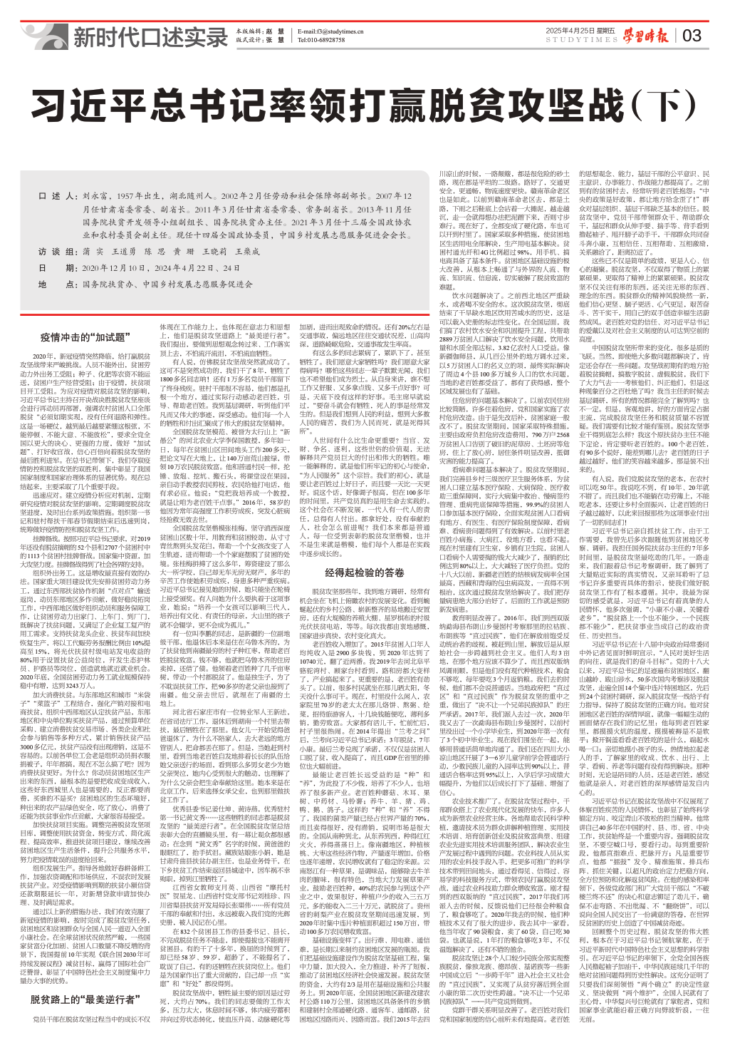 口述人:劉永富,1957年出生,湖北隨州人。2002年2月任勞動和社會保障部副部長。2007年12月任甘肅省委常委、副省長。2011年3月任甘肅省委常委、常務(wù)副省長。2013年11月任國務(wù)院扶貧開發(fā)領(lǐng)導(dǎo)小組副組長、國務(wù)院扶貧辦主任。2021年3月任十三屆全國政協(xié)農(nóng)業(yè)和農(nóng)村委員會副主任。現(xiàn)任十四屆全國政協(xié)委員,中國鄉(xiāng)村發(fā)展志愿服務(wù)促進(jìn)會會長。