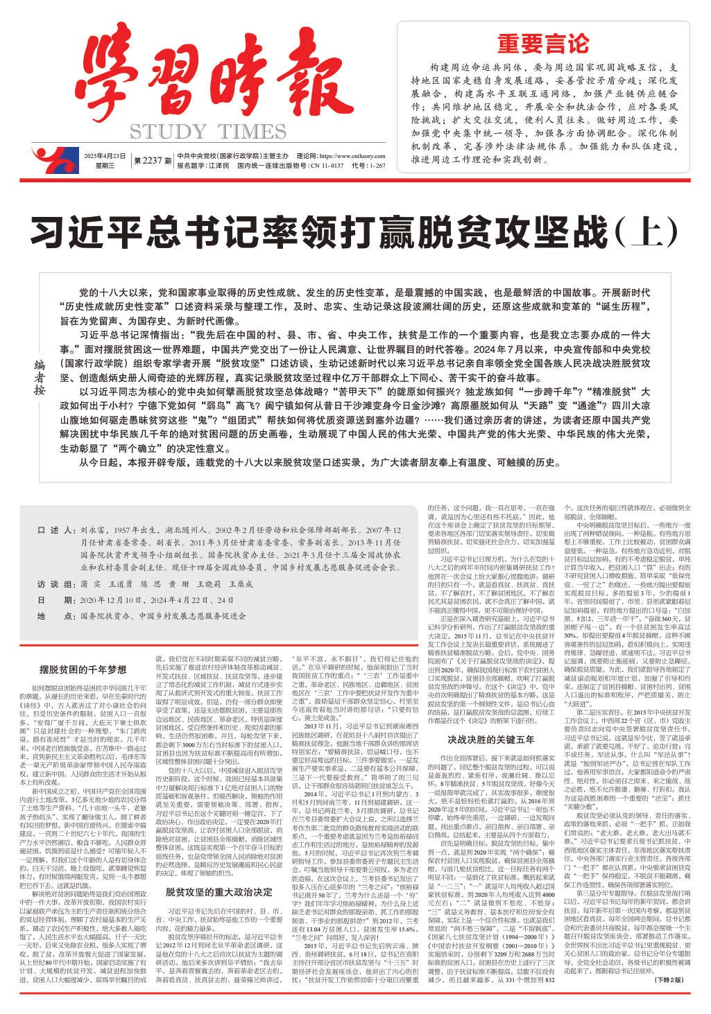 習(xí)近平總書記深情指出:“我先后在中國的村、縣、市、省、中央工作,扶貧是工作的一個(gè)重要內(nèi)容,也是我立志要辦成的一件大事?!泵鎸?duì)擺脫貧困這一世界難題,中國共產(chǎn)黨交出了一份讓人民滿意、讓世界矚目的時(shí)代答卷。2024年7月以來,中央宣傳部和中央黨校(國家行政學(xué)院)組織專家學(xué)者開展“脫貧攻堅(jiān)”口述訪談,生動(dòng)記述新時(shí)代以來習(xí)近平總書記親自率領(lǐng)全黨全國各族人民決戰(zhàn)決勝脫貧攻堅(jiān)、創(chuàng)造彪炳史冊(cè)人間奇跡的光輝歷程,真實(shí)記錄脫貧攻堅(jiān)過程中億萬干部群眾上下同心、苦干實(shí)干的奮斗故事。