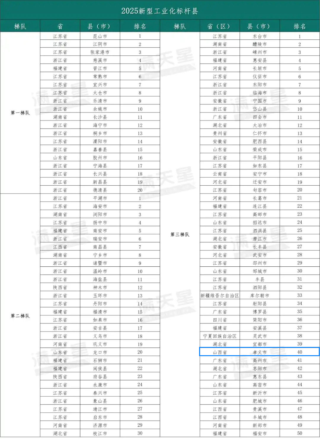 日前,賽迪方略縣域經(jīng)濟(jì)研究中心發(fā)布了《2025新型工業(yè)化標(biāo)桿縣》名單,孝義市成功上榜,位列第三梯隊(duì)第40位,成為我省唯一入選的縣市。
