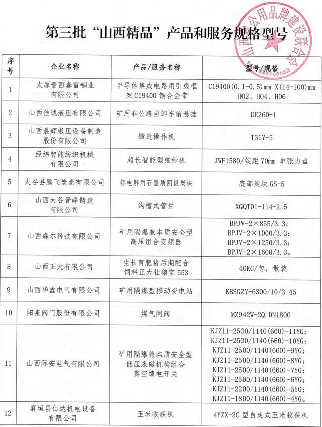 本報訊(記者孟婷)6月27日,記者從山西省公用品牌建設(shè)聯(lián)合會獲悉,經(jīng)過企業(yè)自愿申報、形式審查、標(biāo)準(zhǔn)先進(jìn)性評價、現(xiàn)場審核、認(rèn)證/采信、征求意見等嚴(yán)格的評定程序,太原晉西春雷銅業(yè)有限公司、經(jīng)緯智能紡織機械有限公司、山西佳誠液壓有限公司、山西正大有限公司、山西麗華大酒店等41家企業(yè)的41個產(chǎn)品和服務(wù)獲評成為2024年度“山西精品”。截至目前,“山西精品”已評選出117家企業(yè)的120個產(chǎn)品和服務(wù)。