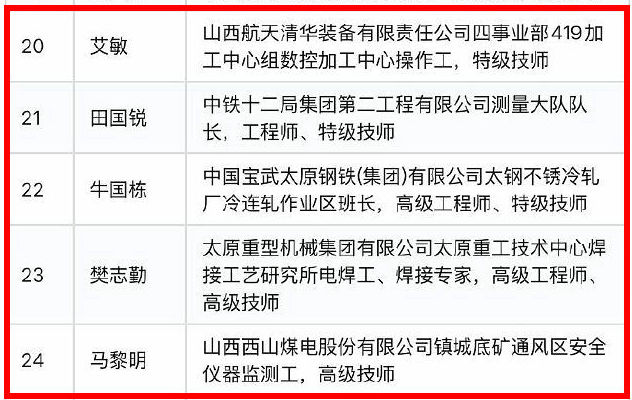 他們分別是:山西航天清華裝備有限責(zé)任公司四事業(yè)部419加工中心組數(shù)控加工中心操作工,特級技師艾敏;中鐵十二局集團(tuán)第二工程有限公司測量大隊隊長,工程師、特級技師田國銳;中國寶武太原鋼鐵(集團(tuán))有限公司太鋼不銹冷軋廠冷連軋作業(yè)區(qū)班長,高級工程師、特級技師牛國棟;太原重型機(jī)械集團(tuán)有限公司太原重工技術(shù)中心焊接工藝研究所電焊工、焊接專家,高級工程師、高級技師樊志勤;山西西山煤電股份有限公司鎮(zhèn)城底礦通風(fēng)區(qū)安全儀器監(jiān)測工,高級技師馬黎明。