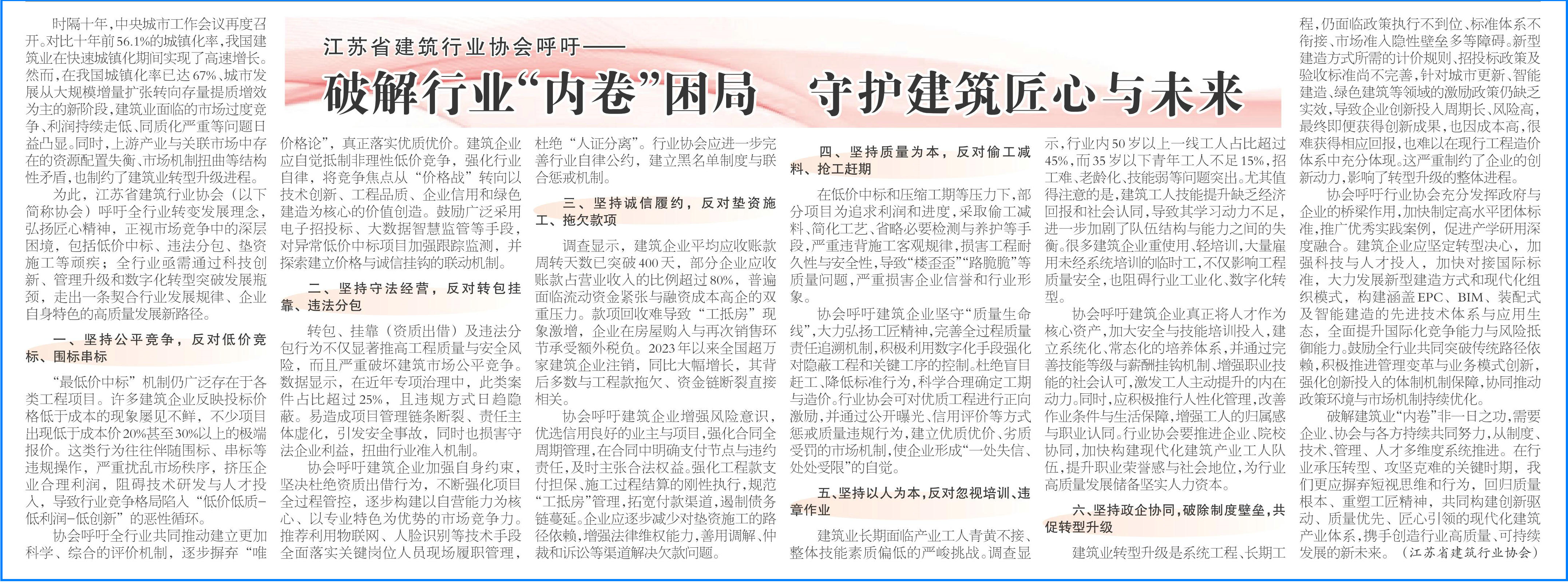 為此,江蘇省建筑行業(yè)協(xié)會(huì)(以下簡(jiǎn)稱協(xié)會(huì))呼吁全行業(yè)轉(zhuǎn)變發(fā)展理念,弘揚(yáng)匠心精神,正視市場(chǎng)競(jìng)爭(zhēng)中的深層困境,包括低價(jià)中標(biāo)、違法分包、墊資施工等頑疾;全行業(yè)亟需通過科技創(chuàng)新、管理升級(jí)和數(shù)字化轉(zhuǎn)型突破發(fā)展瓶頸,走出一條契合行業(yè)發(fā)展規(guī)律、企業(yè)自身特色的高質(zhì)量發(fā)展新路徑。