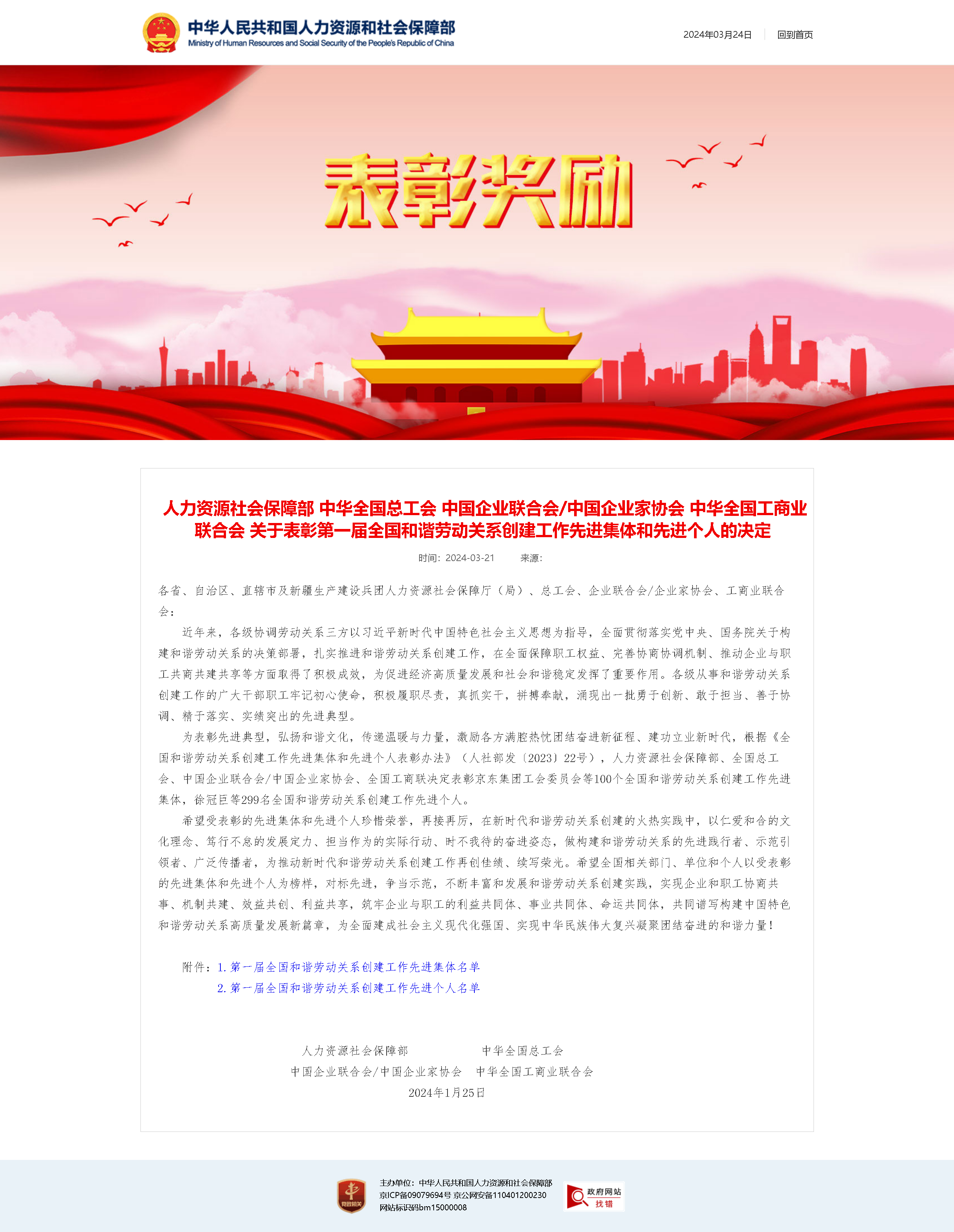 為表彰先進(jìn)典型,弘揚(yáng)和諧文化,傳遞溫暖與力量,激勵(lì)各方滿腔熱忱團(tuán)結(jié)奮進(jìn)新征程、建功立業(yè)新時(shí)代,根據(jù)《全國(guó)和諧勞動(dòng)關(guān)系創(chuàng)建工作先進(jìn)集體和先進(jìn)個(gè)人表彰辦法》(人社部發(fā)〔2023〕22號(hào)),人力資源社會(huì)保障部、全國(guó)總工會(huì)、中國(guó)企業(yè)聯(lián)合會(huì)/中國(guó)企業(yè)家協(xié)會(huì)、全國(guó)工商聯(lián)決定表彰京東集團(tuán)工會(huì)委員會(huì)等100個(gè)全國(guó)和諧勞動(dòng)關(guān)系創(chuàng)建工作先進(jìn)集體,徐冠巨等299名全國(guó)和諧勞動(dòng)關(guān)系創(chuàng)建工作先進(jìn)個(gè)人。