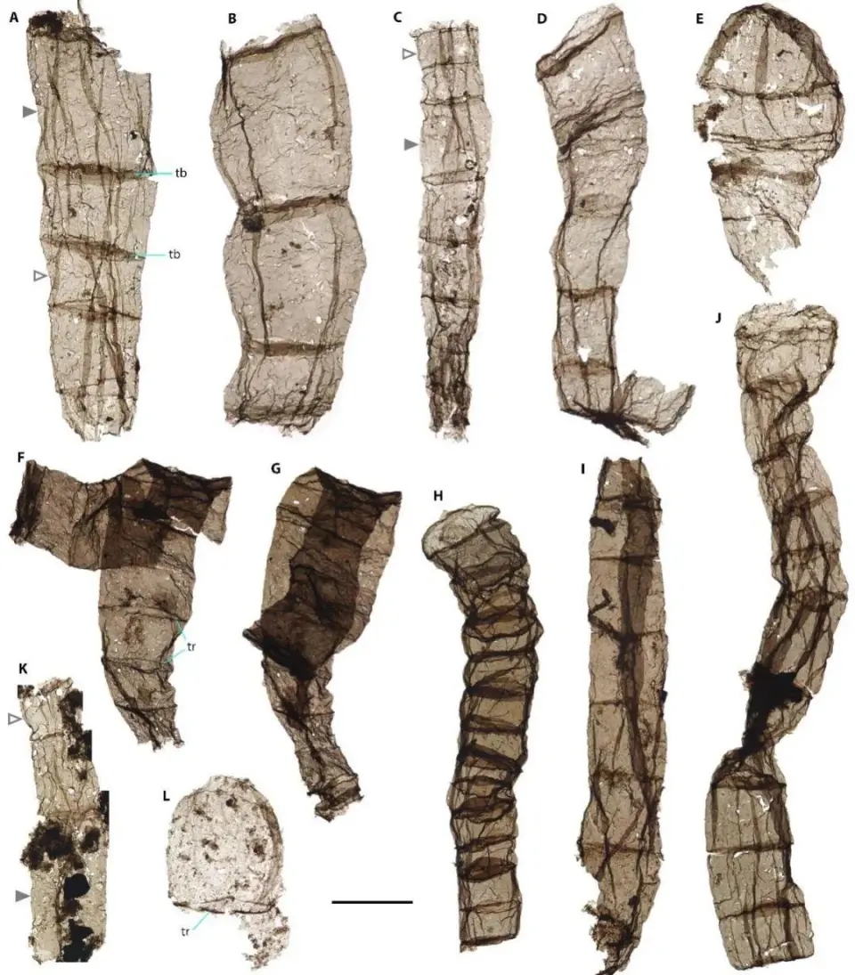 ▲串嶺溝組中發(fā)現(xiàn)的壯麗青山藻?;4鏋橛袡C質(zhì)壁構成的多細胞絲狀體,顯示細胞大小和形態(tài)的變化引起的絲狀體形態(tài)變化。絲狀體直徑向一端收縮(A-D、F-I、K),絲狀體直徑不變(J),保存有完整端部的絲狀體(E、L)。比例尺對于F-H和K代表100微米,其余的代表50微米。