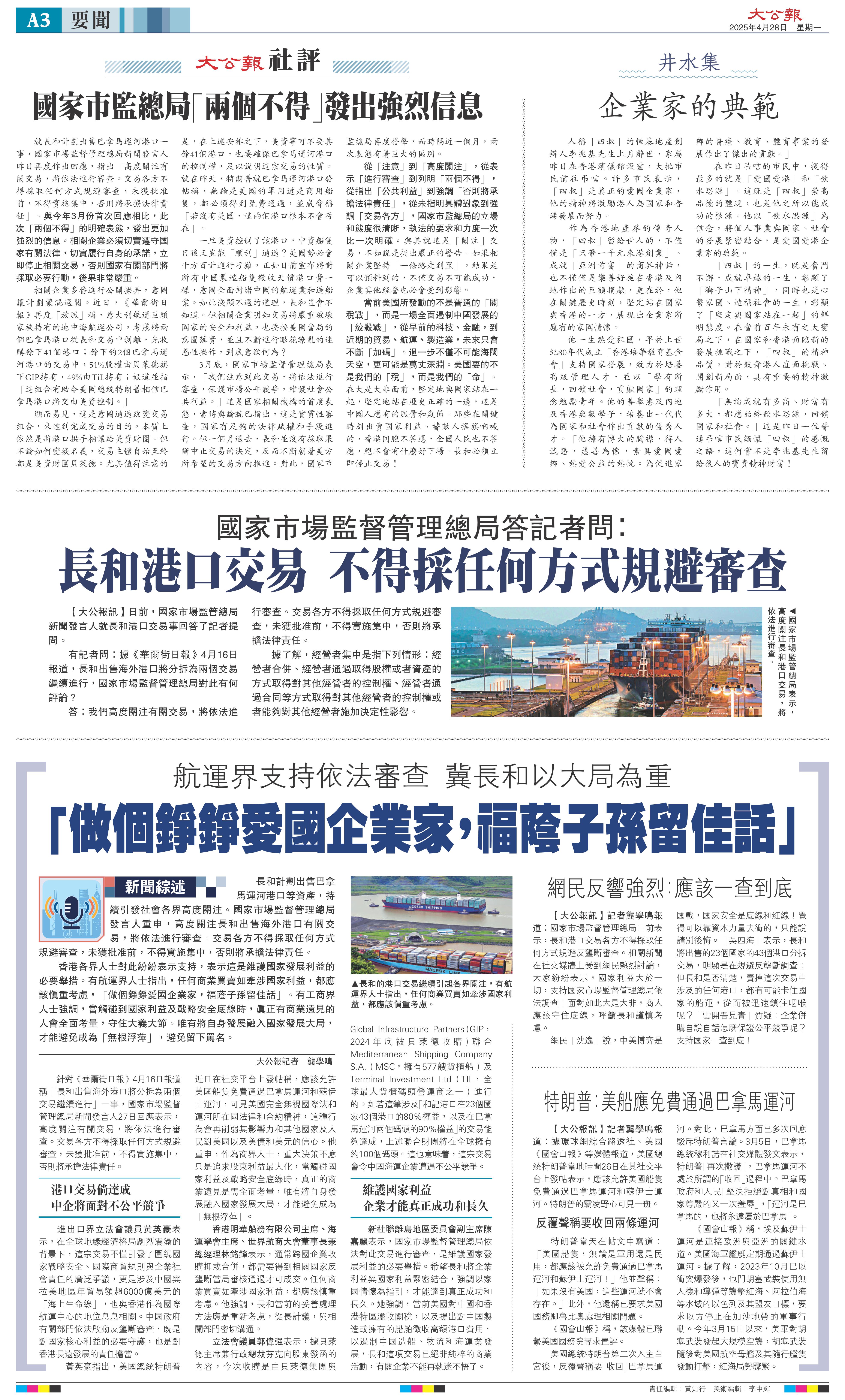 新聞綜述/航運界支持依法審查冀長和以大局為重「做個錚錚愛國企業(yè)家,福蔭子孫留佳話」