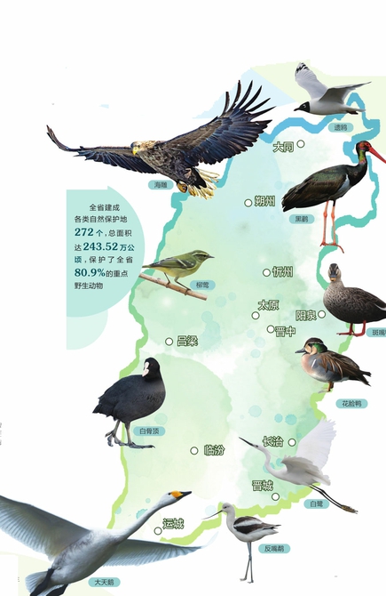 褐馬雞:分布范圍從28個縣域、3個保護區(qū)擴大到45個縣、20個保護區(qū),數(shù)量1.9萬只左右,穩(wěn)居全國首位