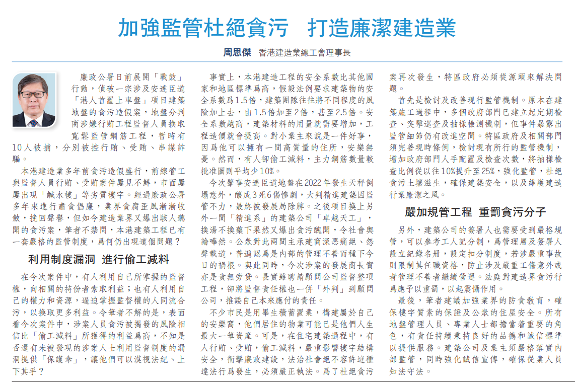 最后,筆者建議加強業(yè)界的防貪教育,確保樓宇質素的保證及公眾的住屋安全。所有地盤管理人員、專業(yè)人士都擔當著重要的角色,有責任持續(xù)秉持良好的品德和誠信標準以提供服務。建筑公司及業(yè)主須嚴格落實內部監(jiān)管,同時強化誠信宣傳,確保從業(yè)人員知法守法。