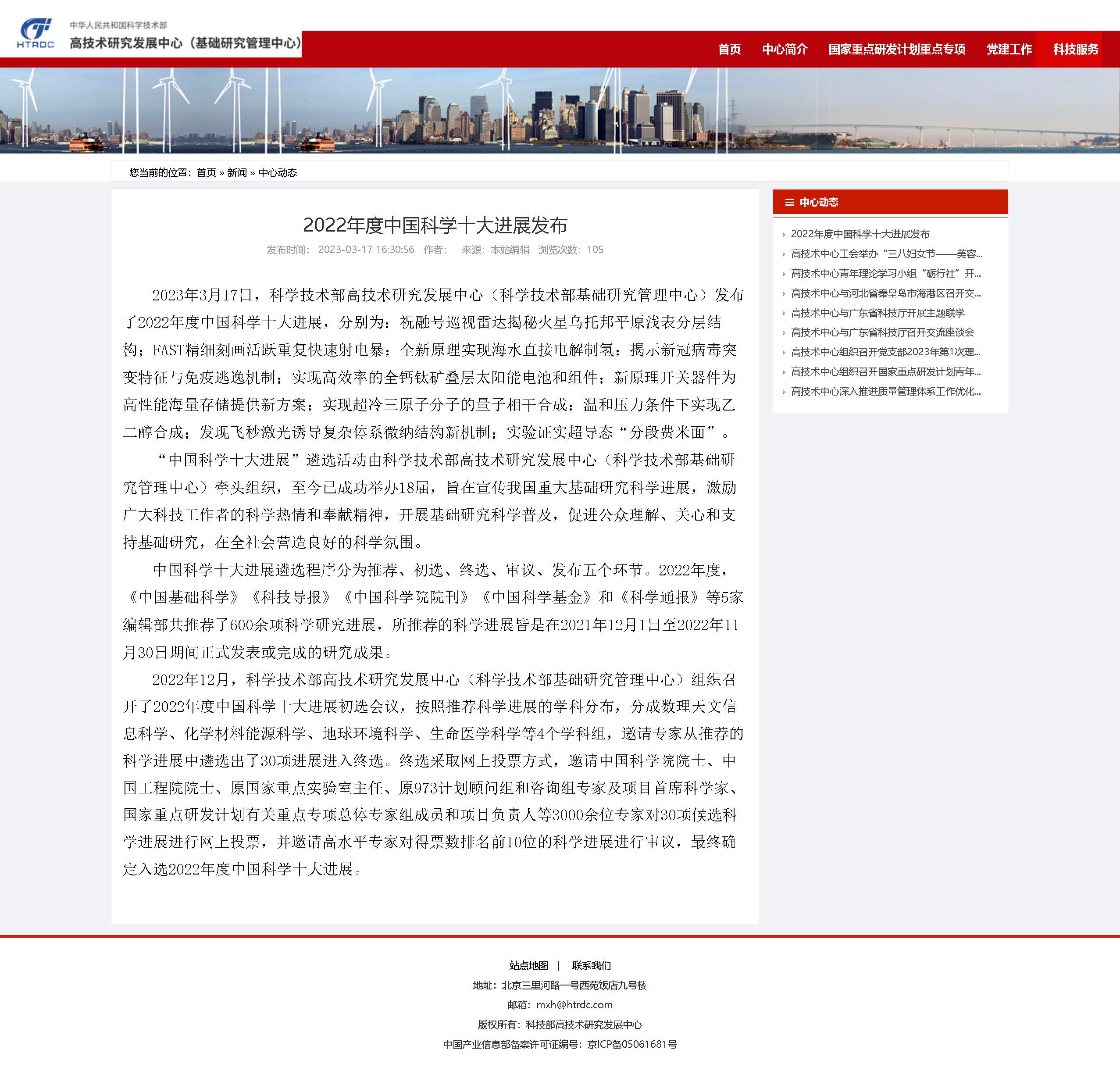科學(xué)技術(shù)部高技術(shù)研究發(fā)展中心(科學(xué)技術(shù)部基礎(chǔ)研究管理中心)于17日發(fā)布2022年度中國科學(xué)十大進(jìn)展,分別為:祝融號巡視雷達(dá)揭秘火星烏托邦平原淺表分層結(jié)構(gòu);FAST精細(xì)刻畫活躍重復(fù)快速射電暴;全新原理實(shí)現(xiàn)海水直接電解制氫;揭示新冠病毒突變特征與免疫逃逸機(jī)制;實(shí)現(xiàn)高效率的全鈣鈦礦疊層太陽能電池和組件;新原理開關(guān)器件為高性能海量存儲提供新方案;實(shí)現(xiàn)超冷三原子分子的量子相干合成;溫和壓力條件下實(shí)現(xiàn)乙二醇合成;發(fā)現(xiàn)飛秒激光誘導(dǎo)復(fù)雜體系微納結(jié)構(gòu)新機(jī)制;實(shí)驗證實(shí)超導(dǎo)態(tài)“分段費(fèi)米面”。