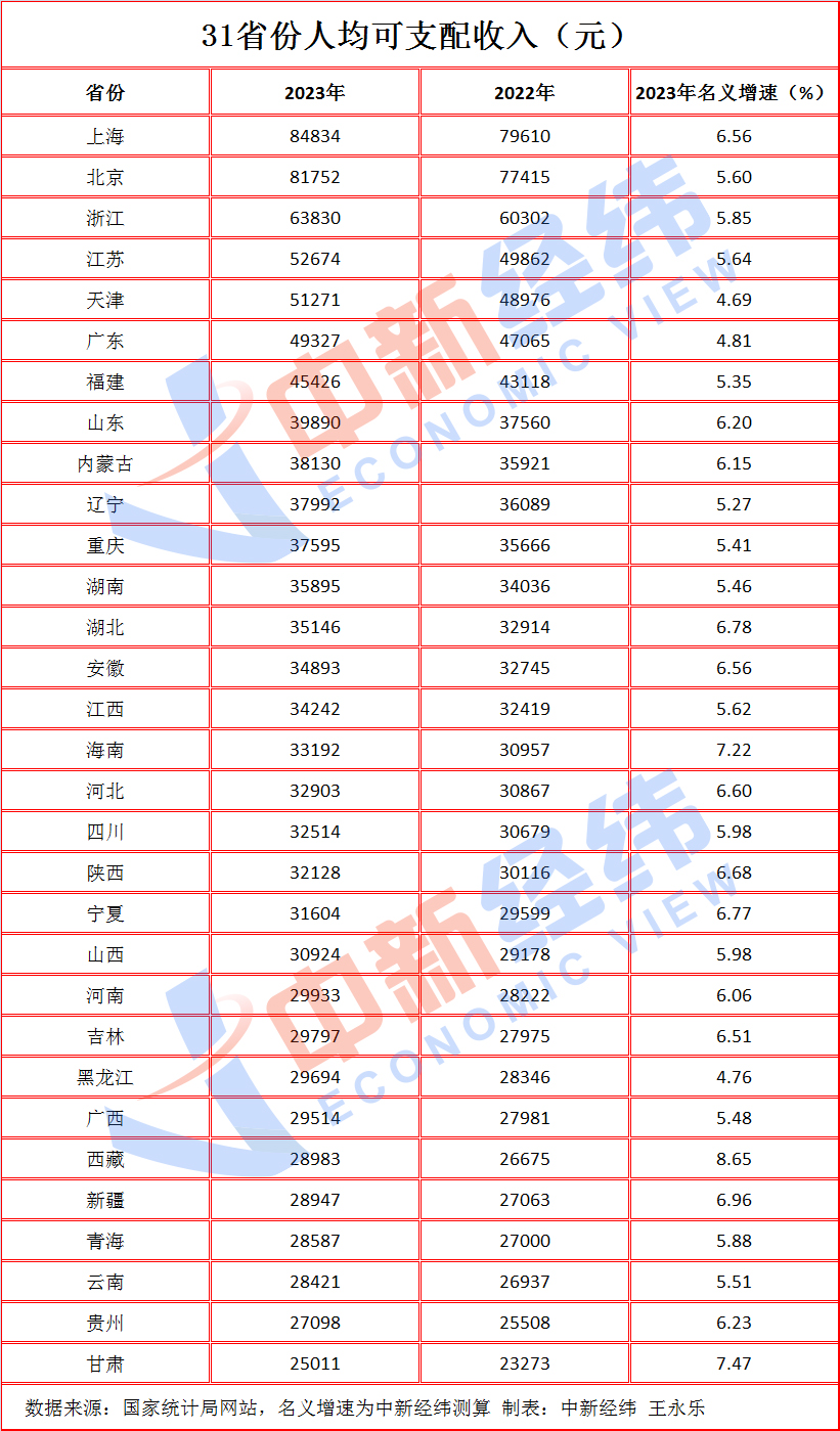 中新經(jīng)緯1月20日電 (王永樂)2023年31省份人均收入榜出爐。國家統(tǒng)計(jì)局19日公布的2023年居民人均可支配收入數(shù)據(jù)顯示,上海、北京、浙江穩(wěn)居前三,上海和北京更是攜手首超8萬元;西藏名義增速最高。你家鄉(xiāng)排第幾?