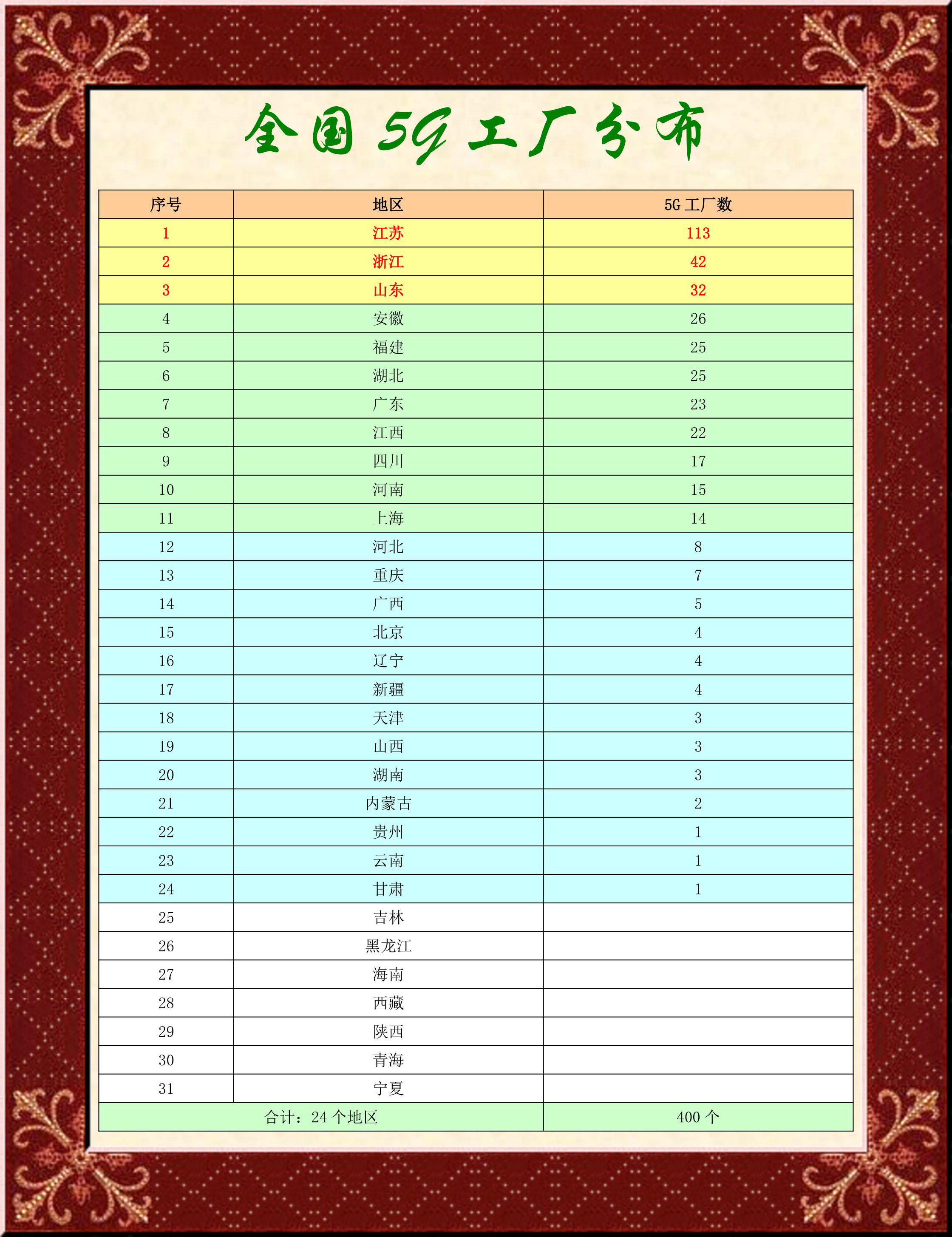 工信部公示全國(guó)400家5G工廠名錄,江蘇以113家獨(dú)占鰲頭,浙江、山東以42和32家成為第二、三名。如果再加第四名安徽的26家,總數(shù)213家,超過(guò)全國(guó)一半還多。