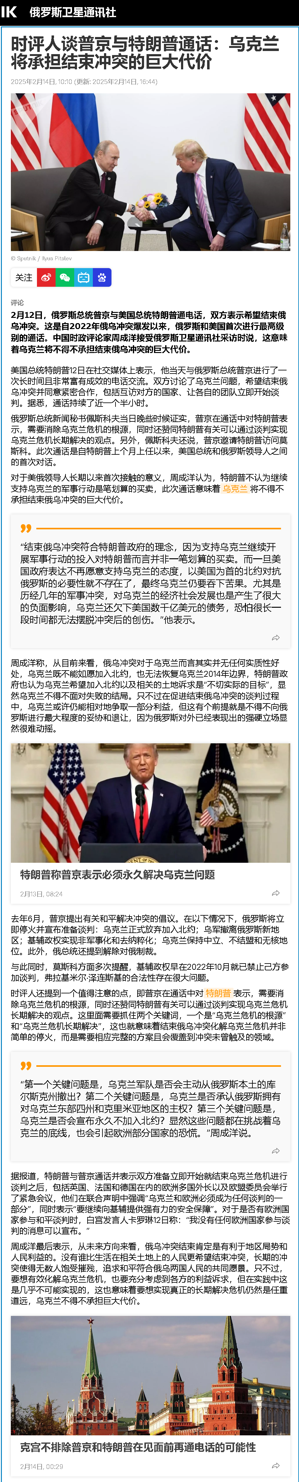 近日,美國總統(tǒng)特朗普先后與俄總統(tǒng)普京、烏總統(tǒng)澤連斯基通電話。他隨后表示,美俄雙方同意就結(jié)束俄烏沖突進(jìn)行“緊密合作”,并派遣各自團(tuán)隊(duì)“立即開始談判”。美國眾議員邁克爾·麥考爾15日在出席慕安會(huì)期間透露,美國國務(wù)卿魯比奧等官員和俄方官員將在沙特阿拉伯會(huì)晤,討論俄烏沖突問題。