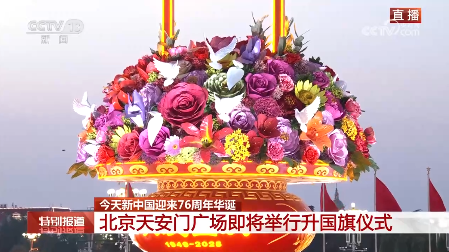 五一廣場(chǎng)上巨型花籃璀璨奪目,慶祝中華人民共和國(guó)成立76周年。江建橋 攝