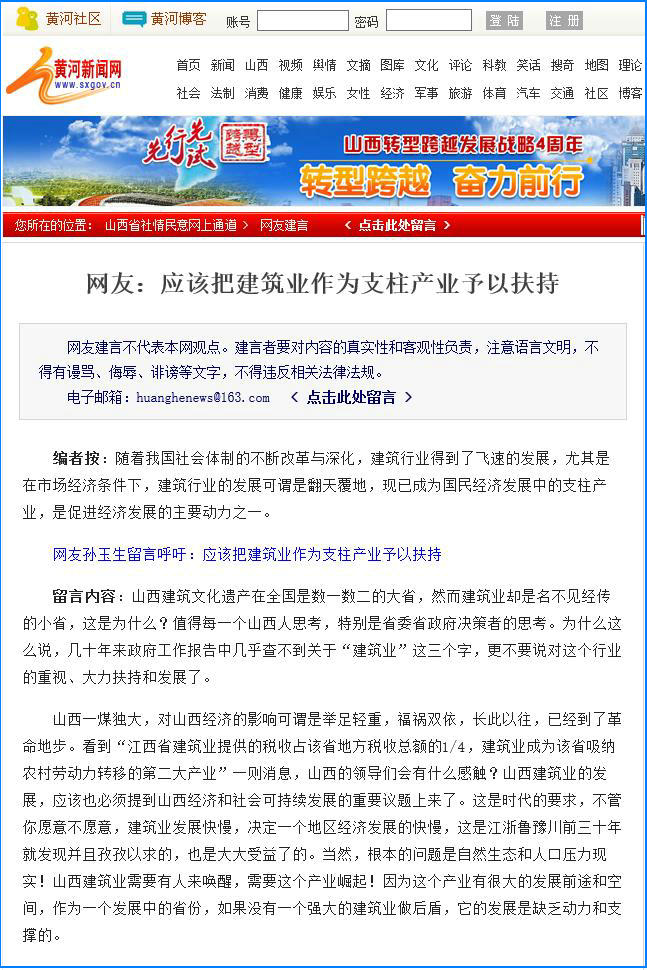 網(wǎng)友孫玉生留言呼吁:應(yīng)該把建筑業(yè)作為支柱產(chǎn)業(yè)予以扶持