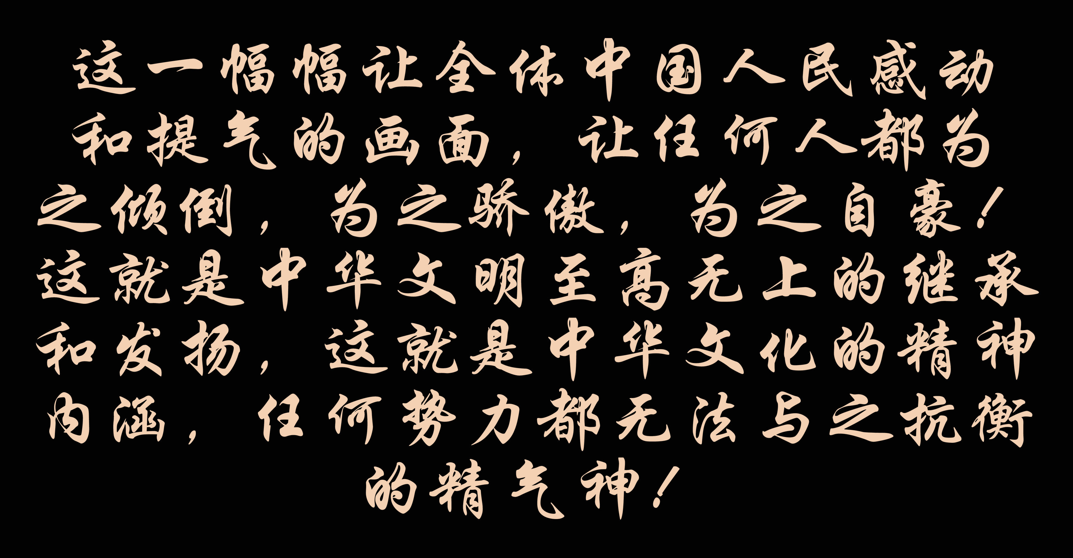 這一幅幅讓全體中國人民感動和提氣的畫面,讓任何人都為之傾倒,為之驕傲,為之自豪!這就是中華文明至高無上的繼承和發(fā)揚,這就是中華文化的精神內(nèi)涵,任何勢力都無法與之抗衡的精氣神!