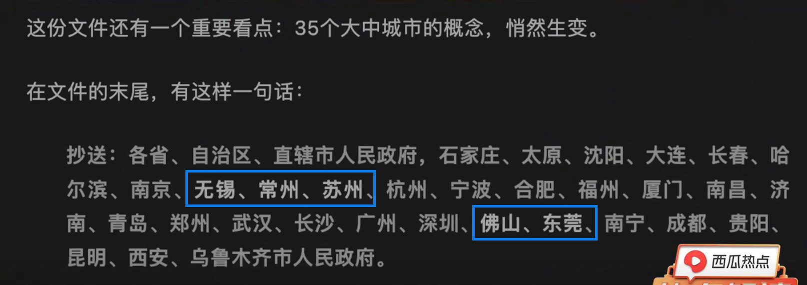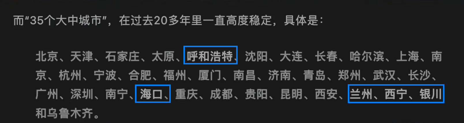 35個大中城市名單:北京、天津、上海、重慶、石家莊、太原、沈陽、大連、長春、哈爾濱、南京、無錫、常州、蘇州、杭州、寧波、合肥、福州、廈門、南昌、濟南、青島、鄭州、武漢、長沙、廣州、深圳、佛山、東莞、南寧、成都、貴陽、昆明、西安、烏魯木齊