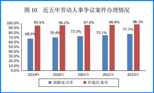 全年全國各級(jí)勞動(dòng)人事爭議調(diào)解組織和仲裁機(jī)構(gòu)共辦理勞動(dòng)人事爭議案件 385.0 萬件,涉及勞動(dòng)者 408.2 萬人。全年辦結(jié)爭議案件 373.4 萬件,結(jié)案金額 829.9 億元。全年勞動(dòng)人事爭議調(diào)解成功率 77.7%,仲裁結(jié)案率 98.1%,仲裁終結(jié)率72.3%。