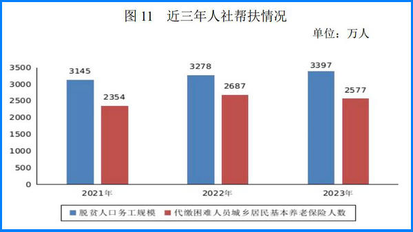 2023 年脫貧人口務(wù)工規(guī)模達(dá)到 3397 萬人。全國組織農(nóng)民工參加補(bǔ)貼性職業(yè)技能培訓(xùn) 643 萬人次。國家鄉(xiāng)村振興重點(diǎn)幫扶地區(qū)職業(yè)技能提升工程完成時(shí)序目標(biāo)任務(wù)。全年共為 2577萬困難人員代繳城鄉(xiāng)居民基本養(yǎng)老保險(xiǎn)費(fèi),困難人員參保率保持在 99%以上。選派 2.1 萬名高校畢業(yè)生到基層從事支農(nóng)和幫扶鄉(xiāng)村振興服務(wù)。